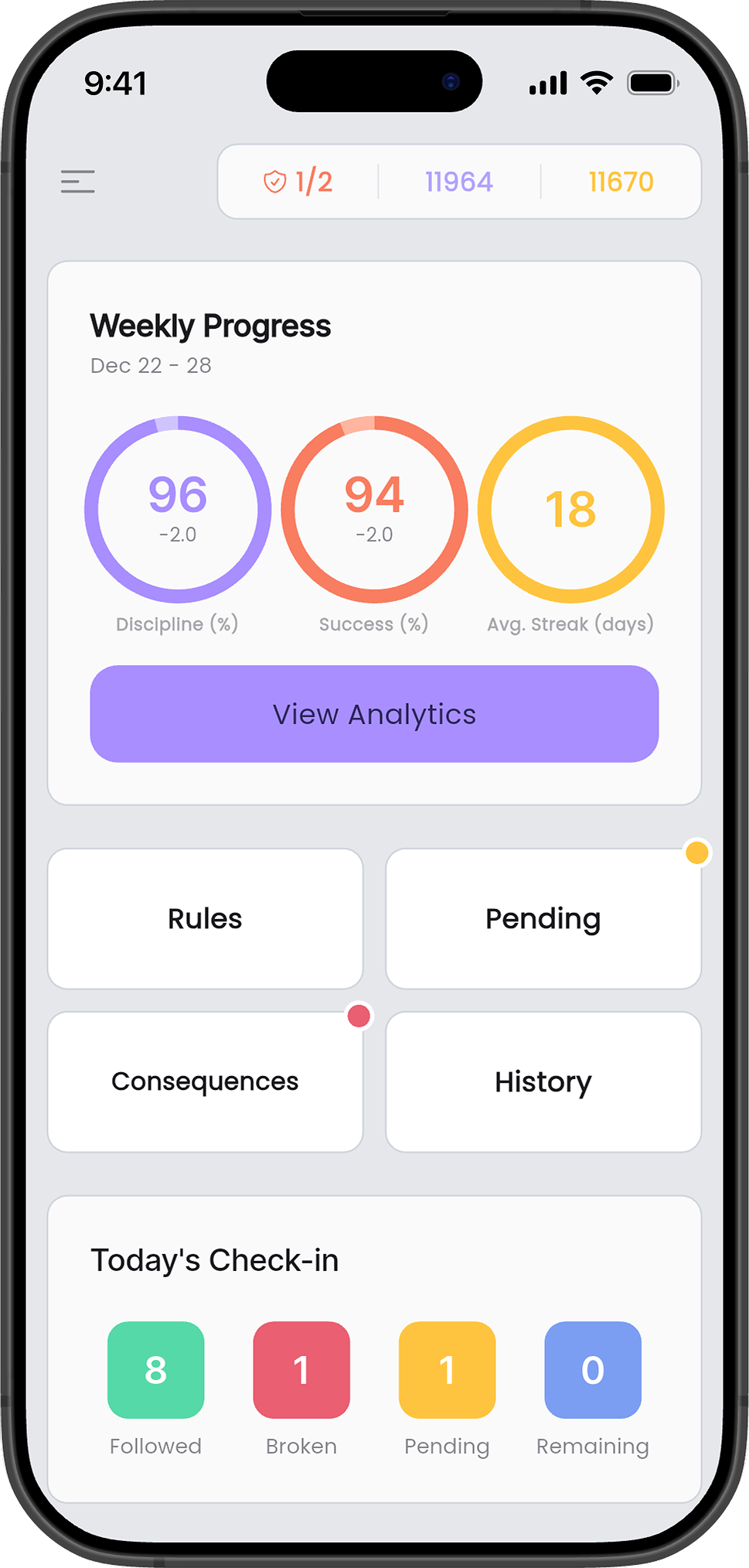 Unlike overwhelming task managers, our focus and accountability tool offers a streamlined approach. Set your rules, log any lapses, and witness your discipline transform through gamified progress tracking, complete with streaks and achievement levels.
